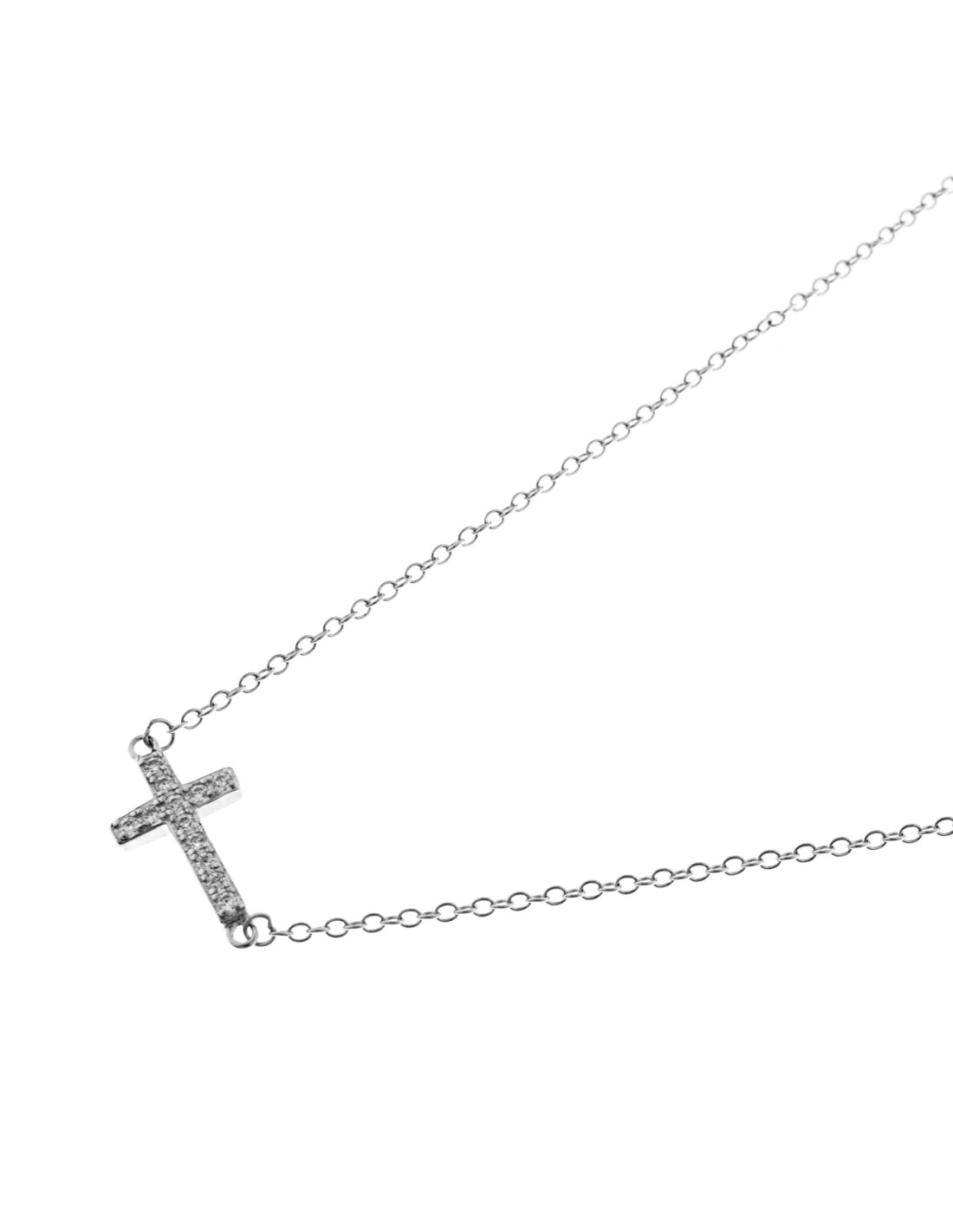Collar con una cruz en horizontal con circonitas blancas de plata de primera ley y baño de rodio para un mejor mantenimiento de la plata.